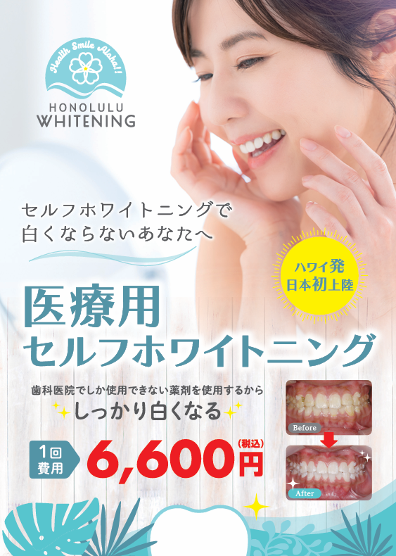 「ホノルルホワイトニング」はオフィスホワイトニングです。このホワイトニングは、セルフホワイトニングになりますので、オフィスホワイトニングとしましては比較的安価に提供することができます。当初は、歯科医が付き添って行いますのでご安心下さいませ。