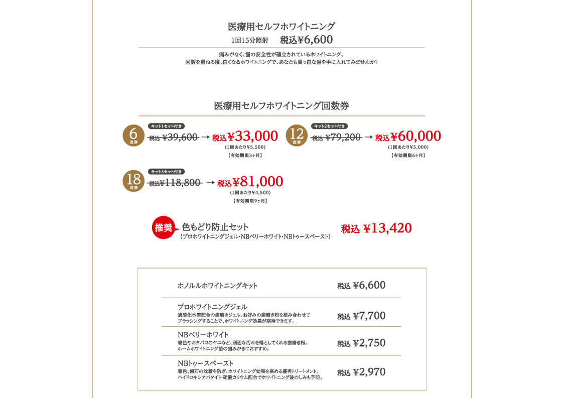 プロホワイトニングジェル(税込8,470円)・NBベリーホワイト(税込3、025円)・NBトゥースペースト(税込3,267円)、色戻りセット(税込14,762円)の誤りです。